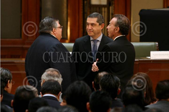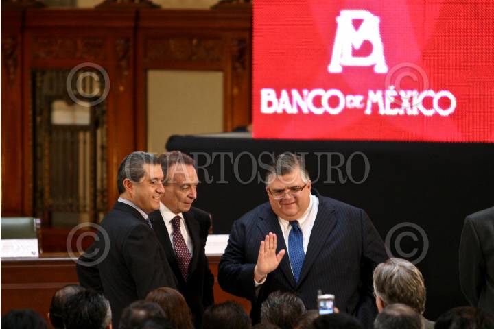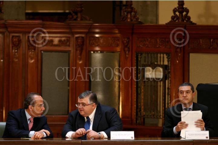 MÉXICO D.F., 23SEPTIEMBRE2009.- Ignacio Deschamps, presidente y director general de BBVA Bancomer y presidente de la Asociación de Bancos de México; Guillermo Ortiz, gobernador del Banco de México y Agustin Carstens, secretario de Hacienda previo al evento de la presentación de los billetes conmemorativos del Centenario de la Revolución y Bicentenario de la Independencia que se realizo en el Salón Tesorería de Palacio Nacional. FOTO: RODOLFO ANGULO/CUARTOSCURO.COM