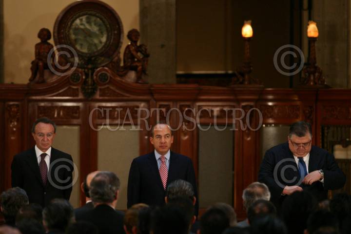 MÉXICO D.F., 23SEPTIEMBRE2009.- Guillermo Ortiz, gobernador del Banco de México; el presidente Felipe Calderón y Agustin Carstens, secretario de Hacienda previo al evento de la presentación de los billetes conmemorativos del Centenario de la Revolución y Bicentenario de la Independencia que se realizo en el Salón Tesorería de Palacio Nacional. FOTO: RODOLFO ANGULO/CUARTOSCURO.COM