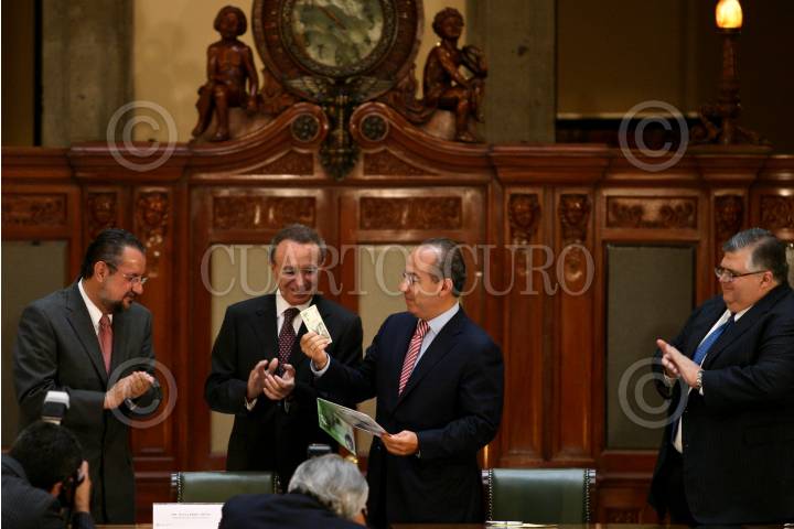MÉXICO D.F., 23SEPTIEMBRE2009.- El presidente Felipe Calderón durante su participación en el evento de la presentación de los billetes conmemorativos del Centenario de la Revolución y Bicentenario de la Independencia que se realizo en el Salón Tesorería de Palacio Nacional. FOTO: RODOLFO ANGULO/CUARTOSCURO.COM
