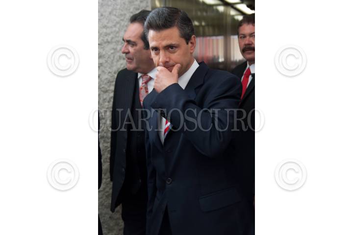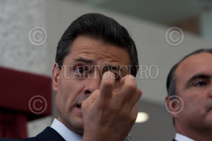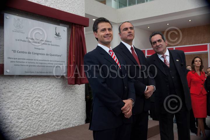 QUERÉTARO, QUERÉTARO, 05FEBRERO2011.- Enrique Paña Nieto, gobernador del Estado de México, acompañó a sus homólogos José Calzada gobernador de Querétaro y Carlos Lozano de Aguascalientes, en la inauguración del Centro de Convenciones que es un espacio de 32 mil metros cuadrados. Este inmueble mantiene aun la demanda por plagio por el arquitecto Teodoro González de León a quien en el sexenio anterior le retiraron la construcción del inmueble tras ganar la licitación. Hoy, el gobernador del estado le reconoció públicamente la autoría del también conocido como Ciudad de las Artes. FOTO: DEMIAN CHÁVEZ/CUARTOSCURO.COM