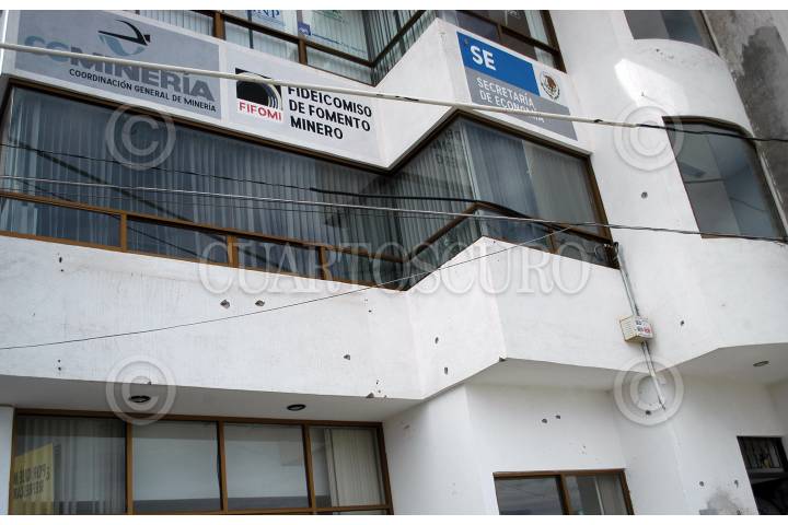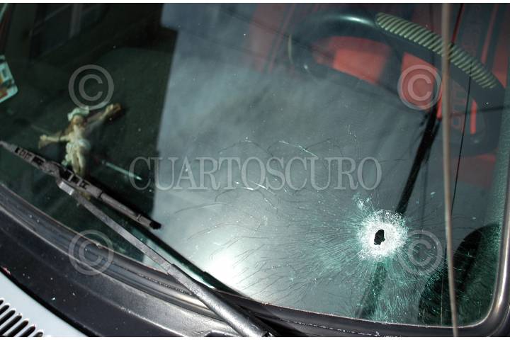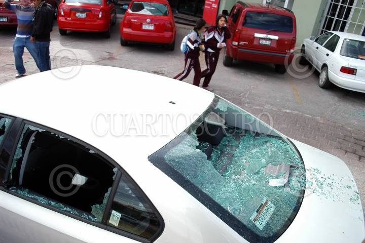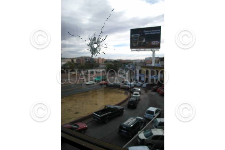 GUADALUPE, ZACATECAS, 02FEBRERO2011.- Impactos de grueso calibre fue el saldo que dejó en vehículos particulares, edificios y algunos locales comerciales, durante el enfrentamiento de ayer por la noche en la avenida García Salinas, entre efectivos de la Policía Estatal y miembros del crimen organizado. El cual tuvo como saldo oficial, siete heridos (2 civiles y 5 elementos de la corporación) un detenido y dos fallecidos (un policía y un sicario). FOTO: CUARTOSCURO.COM