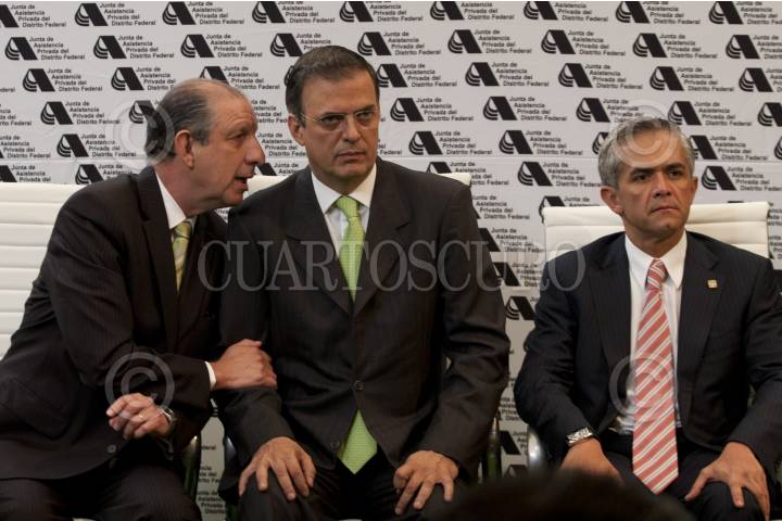 MÉXICO D.F., 05JULIO2011.- Marcelo Ebrard Casaubon, Jefe del Gobierno capitalino, acompañado de Lourdes Sarvide Álvarez Icaza, Representante de las Instituciones de Asistencia Privada Consejera Titular del Rubro de Discapacidad y Rehabilitación, Rogelio Casas Alatriste Presidente de la Junta de Asistencia Privada del Distrito Federal, Elías Miguel Moreno Brizuela, Secretario de Protección Civil del Gobierno del Distrito Federal, Miguel Ángel Macera, Procurador del D.F. encabezo la ceremonia de inauguración del Centro de Capacitación e Información del Sector Social de la Junta de Asistencia Privada del DF. El jefe de gobierno se retira lapíz labial momentos antes de emitir su mensaje. FOTO: GUILLERMO PEREA/CUARTOSCURO.COM