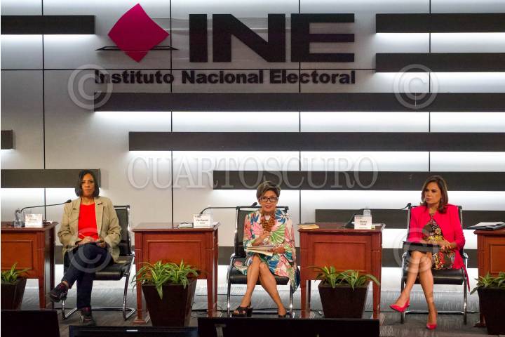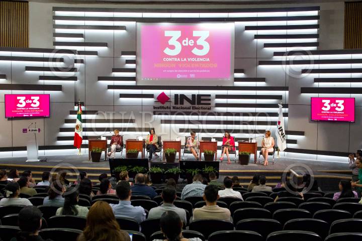 Blanca Piña, Norma de la Cruz, Flor León, Blanca Alcalá, Aurora Aguilar, durante el Foro la 3 de 3 en la sede del INE.