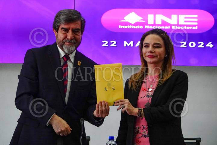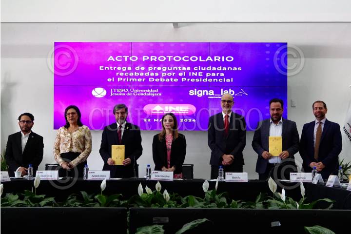 CIUDAD DE MÉXICO, 22MARZO2024.- Claudia Zavala, consejera electoral, Humberto Orozco, director de relaciones exteriores de ITESO, Carla Humphrey, consejera electoral e Iván Flores, encargado del despacho de la coordinación de comunicaciones, encabezaron el acto protocolario de entrega de preguntas ciudadanas recabadas por el Instituto Nacional Electoral para el Primer Debate Presidencial, esto en el auditorio del instituto. FOTOS: ROGELIO MORALES /CUARTOSCURO.COM