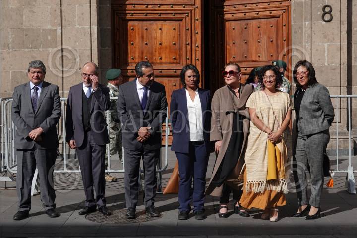 CIUDAD DE MÉXICO, 09ENERO2025.- Las consejeras y consejeros electorales: Uuc-Kib Espadas Ancona; Martín Faz; Jorge Montaño; Norma Irene De la Cruz; Guadalupe Taddei (presidenta); Rita Bell López y Claudia Zavala posan para los medios durante su salida de Palacio Nacional tras la reunión con la presidenta Claudia Sheinbaum para discutir la solicitud de ampliación al presupuesto con motivo de las elecciones del Poder Judicial. FOTO: GALO CAÑAS/CUARTOSCURO.COM