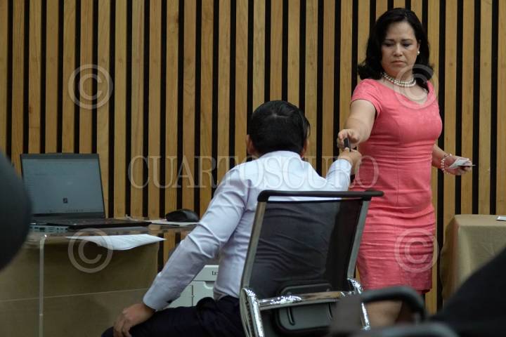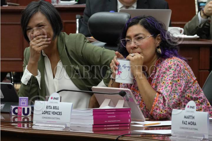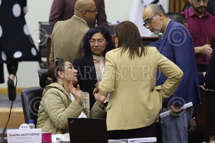 CIUDAD DE MÉXICO, 18JUNIO2025.- La secretaria general del INE, Claudia Arlette Espino, dialoga con las consejeras Rita Bell, Claudia Zavala y el consejero Martín Faz, esto luego de declarar un receso tras no llegar a un acuerdo dentro de las votaciones de distintos puntos que se pusieron a discusión durante la sesión extraordinaria de este miércoles en el INE. FOTO: DANIEL AUGUSTO/ CUARTOSCURO.COM