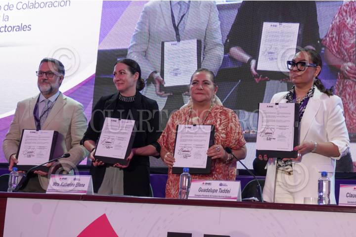 CIUDAD DE MÉXICO 31MAYO2025.- Guadalupe Taddei Zavala, consejera presidenta, acompañada de Norma Irene de la Cruz Magaña, Rita Bell López Vences, consejeras electorales y Katherine Elena, Vicepresidenta de la Fundación Internacional para Sistemas Electorales, durante la Firma del Convenio Específico de Colaboración entre el Instituto Electoral y la Fundación Internacional para Sistemas Electorales, esto en el marco de la jornada del Proceso Electoral Extraordinario para la elección de diversos cargos del Poder Judicial de la Federación 2024-2025 en el Instituto Nacional Electoral. FOTO: ROGELIO MORALES CUARTOSCURO.COM