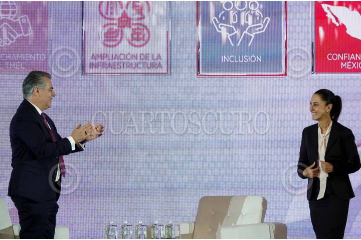 CIUDAD DE MÉXICO, 19JUNIO2024.- Francisco Cervantes Díaz, presidente del Consejo Coordinador Empresarial (CCE), y Claudia Sheinbaum, presidenta electa de México, durante la Reunión Anual del CCE en la que expuso su propuesta para mantener las inversiones y el llamado a las y los empresario a continuar el diálogo para el desarrollo del país. FOTO: GALO CAÑAS/CUARTOSCURO.COM