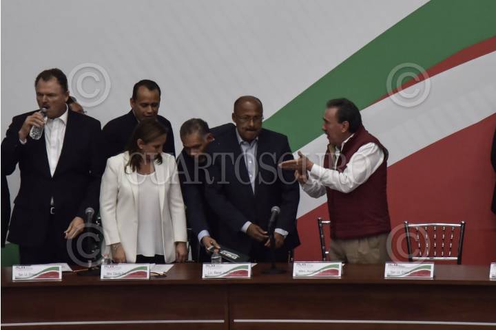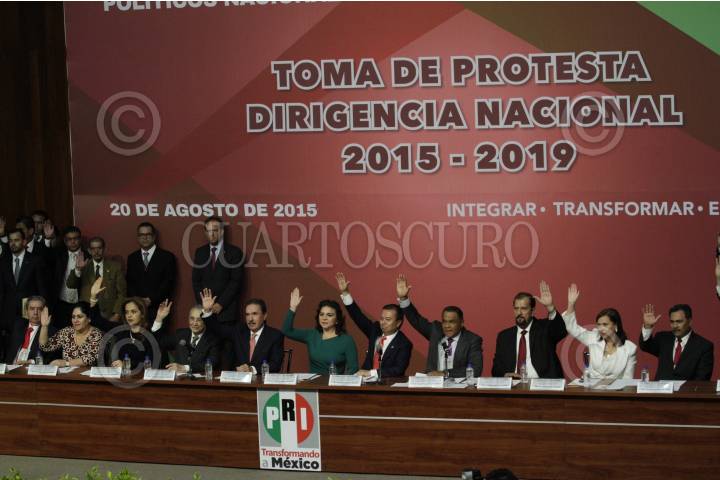 MÉXICO, D.F., 20AGOSTO2015.- Manlio Fabio Beltrones y Carolina Monroy del Mazo, rindieron protesta como presidente y secretaria general del PRI, respectivamente, ante el consejo político del partido. FOTO: MOISÉS PABLO /CUARTOSCURO.COM