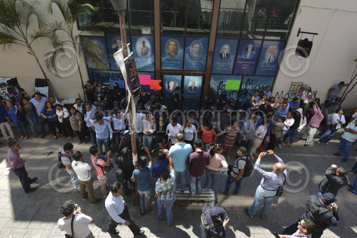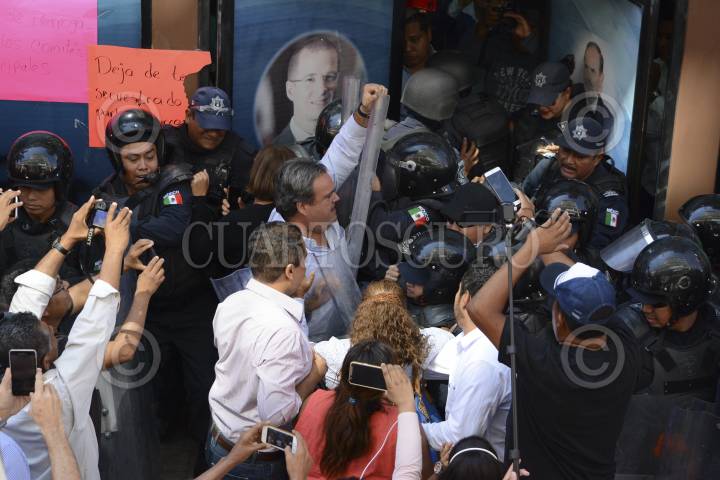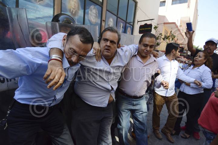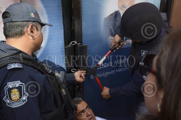 CHILPANCINGO, GUERRERO, 12FEBRERO2017.- Eloy Salmerón Díaz, secretario general del Comité Estatal del Partido Acción Nacional (PAN), cerró con candado las instalaciones del partido, para evitar la instalación de su Consejo Político. Los inconformes acusaron a su diregente Marco Antonio Maganda Villalba de no entregar los recursos correspondientes a los cómites municipales, ne potiso y pretender impoder a los consejeros. Tras varios minutos de tensión, elementos de la policía estatal acudieron al lugar donde ropieron el candado para permitir el acceso a los consejeros y así poder continuar con la convocatoria de instalación del consejo. FOTO: JOSÉ I. HERNÁNDEZ /CUARTOSCURO.COM