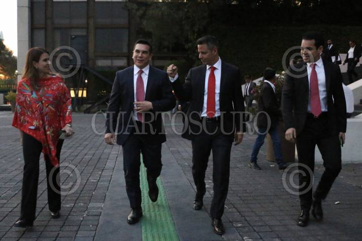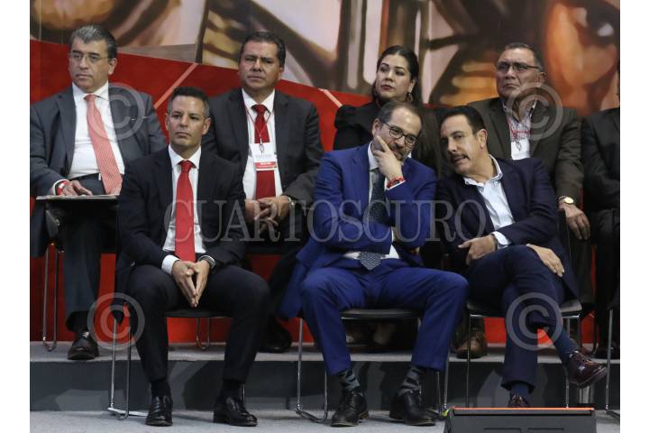 CIUDAD DE MÉXICO, 21NOVIEMBRE.- Carolina Viggiano, secretaria general del PRI, Alejandro Moreno, presidente nacional del Parido Revolucionario Institucional y Alejandro Murat Hinojosa, gobernador de Oaxaca, durante la Sesión Solemne de Instalación del VII Consejo Político Nacional y XLIX Sesión Extraordinaria en el Auditorio “Plutarco Elías Calles” en la sede del parido. FOTO: ROGELIO MORALES /CUARTOSCURO.COM