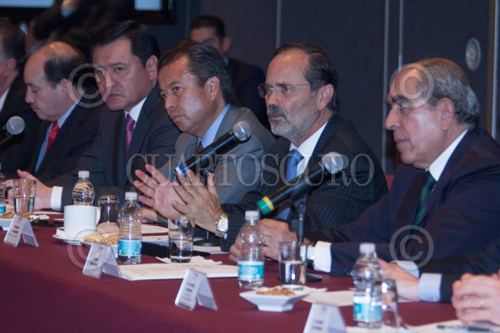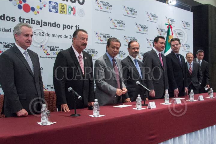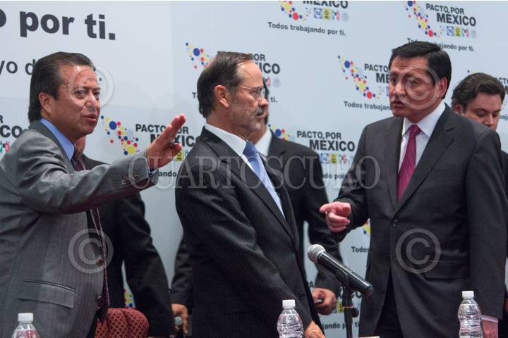 MÉXICO, D.F., 22MAYO2013.- Miguel Ángel Osorio Chong, Secretario de Gobernación junto a Cesar Camacho Quiroz, Líder Nacional del PRI; Gustavo Madero, Líder del PAN y Pablo Gómez, Representante del PRD ante el Pacto por México durante la reunión que mantuvieron los integrantes del Consejo Rector del Pacto por México con Integrantes del Sindicato Nacional de Trabajadores del Estado. FOTO: ENRIQUE ORDÓÑEZ /CUARTOSCURO.COM