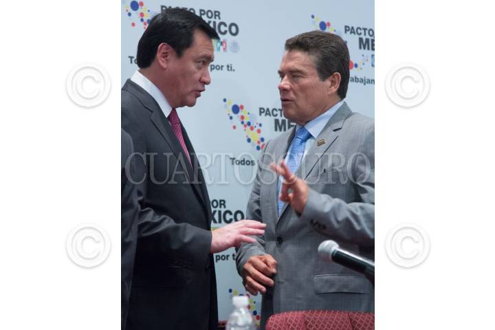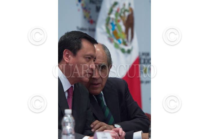 MÉXICO, D.F., 22MAYO2013.- Miguel Ángel Osorio Chong, Secretario de Gobernación junto a Pablo Gomez, Integrante Rector del Pacto por México y representante del PRD durante la reunión de los integrantes del Consejo Rector del Pacto por México con Integrantes del Sindicato Nacional de Trabajadores del Estado. FOTO: ENRIQUE ORDÓÑEZ /CUARTOSCURO.COM