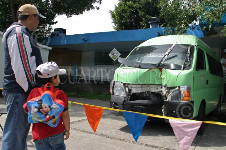 MÉXICO, D.F., 05AGOSTO2010.- Un padre mostró a su hijo, una camioneta de transporte publico chocado y como muestra en el deportivo Jose Maria Morelos y Pavón, como parte de las actividades que realizó la Secretaria de Seguridad Publica en la delegación Álvaro Obregón en torno a la educación vial, con la finalidad de evitar futuros accidentes. FOTO: ENRIQUE ORDÓÑEZ/CUARTOSCURO.COM