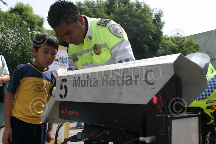 MÉXICO, D.F., 05AGOSTO2010.- Un policía de transito, mostró a los niños el funcionamiento del "Multa Radar" que usan en las vías rápidas como parte de las actividades que realizó la Secretaria de Seguridad Publica en la delegación Álvaro Obregón en torno a la educación vial, con la finalidad de evitar futuros accidentes. FOTO: ENRIQUE ORDÓÑEZ/CUARTOSCURO.COM