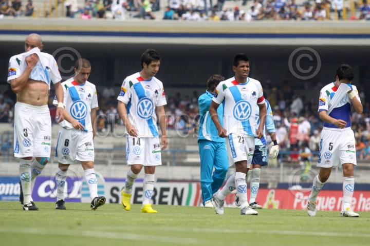MÉXICO, D.F., 07MARZO2010.- Jugadores del Puebla salen de la cancha la ser derrotados por los Pumas de la UNAM que consiguieron su tercera victoria en casa; anotando cuatro goles y sumado 16 puntos en la fecha 9 del Torneo Bicentenario. FOTO: SÁSHENKA GUTIÉRREZ/CUARTOSCURO.COM