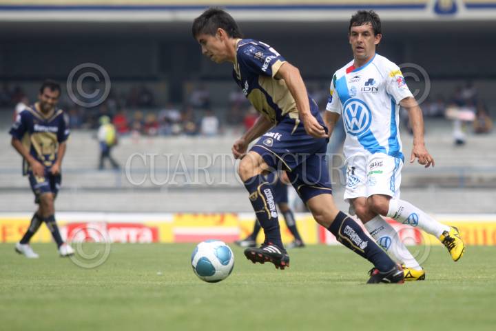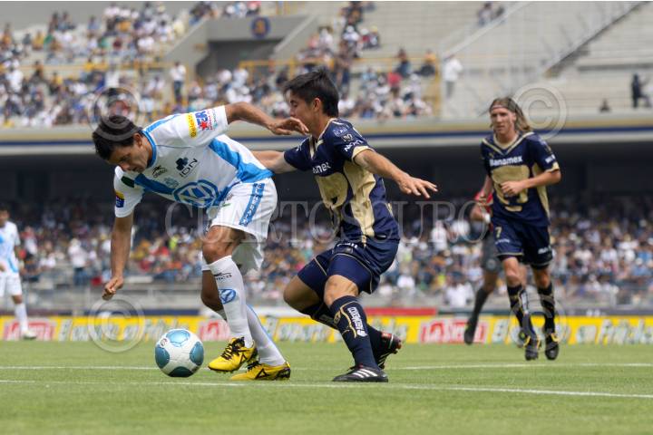 MÉXICO, D.F., 07MARZO2010.- Efraín Velarde disputa el balon durante el encuentro con Puebla en el estadio Universitario donde los Pumas de la UNAM consiguieron su tercera victoria en casa; anotando cuatro goles y sumado 16 puntos en la fecha 9 del Torneo Bicentenario. FOTO: SÁSHENKA GUTIÉRREZ/CUARTOSCURO.COM