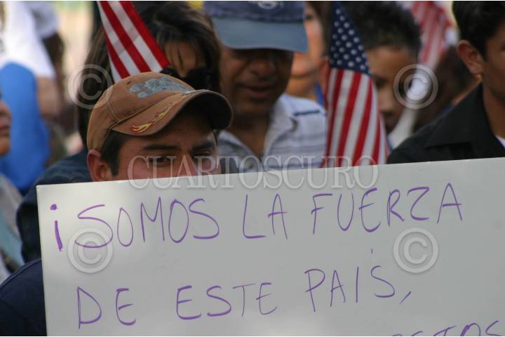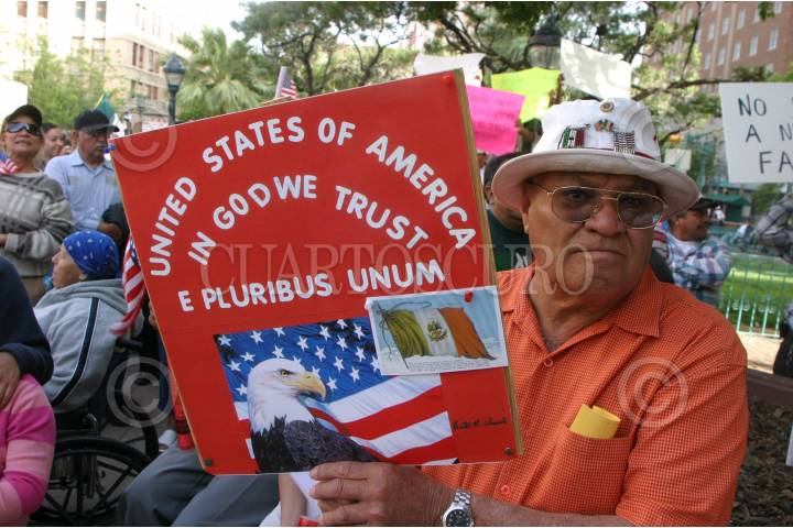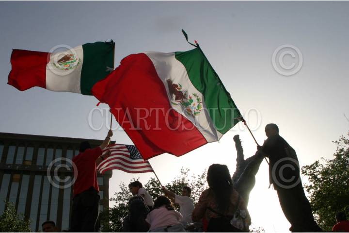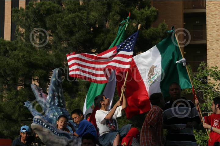 EL PASO, TEXAS 10ABRIL 2007.- Cientos de estudiantes, trabajadores agricolas, asi como una serie de ONG's que defienden los derechos de los migrantes hispanos, marcharon por las calles de esta ciudad fronteriza en protesta por las constantes redadas y deportaciones de que son objetos grupos de migrantes hispanos en este pais. En el evento que se llevo a cabo en la plaza de san Jacinto,los manifestantes portaron banderas mexicanas y de los Estados Unidos. FOTO: JOSÉ JOAQUIN MURRIETA/CUARTOSCURO.COM