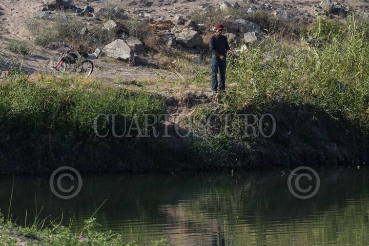MEXICALI, BAJA CALIFORNIA, 11MARZO2018.- Actualmente, el agua que proviene del Río Colorado a Baja California es recibida a través de la presa Morelos en el Valle de Mexicali, la cual provee de agua a los municipios de Ensenada y Tijuana. Sin embargo, de acuerdo con Modesto Ortega, ex director de la Comisión Estatal de Servicios Públicos de Mexicali, y quien fue despedido de su cargo durante el gobierno de Enrique Vega de la Madrid por oponerse a la construcción de un acueducto de forma ilegal para la cervecera Constellation Brands, el crecimiento poblacional e industrial desmedido en Tijuana ha provocado que algunos módulos de riego vendan ilegalmente una mayor cantidad de agua que la establecida a Tijuana. Asimismo, la venta ilegal de agua, aunada a medidas como el revestimiento de cemento del canal Todo Americano, han dejado sin agua a muchos ejidatarios causándoles pérdidas año con año en sus ganancias. Además del desabasto, las colonias en Ensenada han dejado de recibir agua potable de la presa ya que ésta se mezcló con aguas negras que vienen de los nuevos fraccionamientos construidos en zonas más altas de la presa. En la imagen, un hombre pesca en la presa Morelos. FOTO: TERCERO DÍAZ /CUARTOSCURO.COM