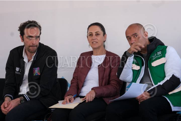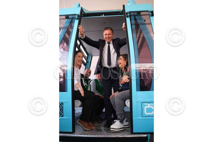 Andrés Lajous, secretario de Movilidad de la capital; Clara Brugada, alcaldesa de Iztapalapa; Claudia Sheinbaum, jefa de Gobierno y Jesús Antonio Esteva Medina, secretario de Obras y Servicios, encabezaron la presentación del arranque de obra del Cable