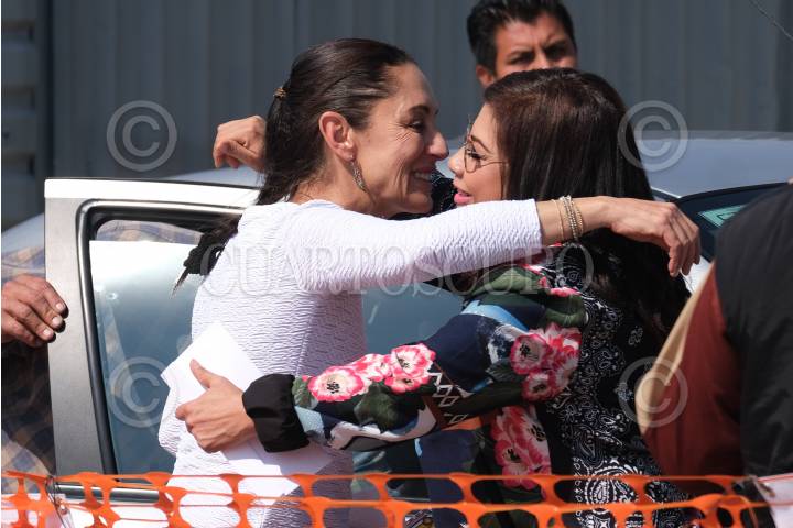 Claudia Sheinbaum, jefa de Gobierno y Clara Brugada, alcaldesa de Iztapalapa al finalizar la presentación del arranque de obra del Cablebús Línea 2.