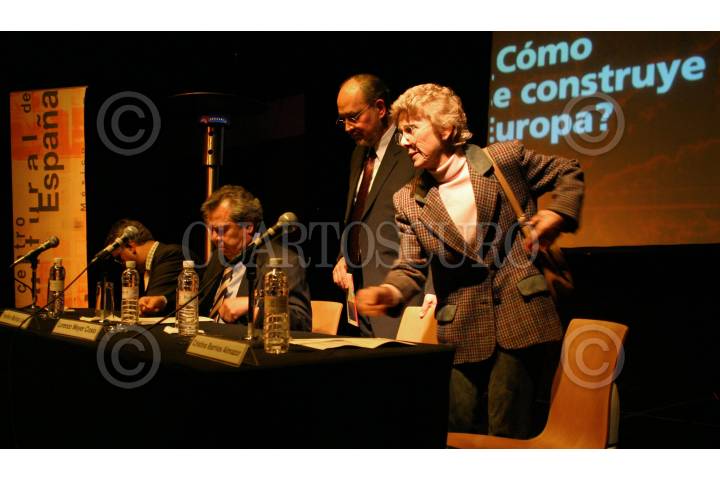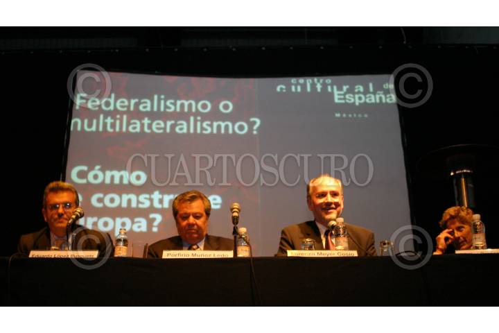 MEXICO, D.F. 20ENERO2005.- Eduardo López, asesor,Porfirio Muñoz Ledo, ex embajador ante la comunidad europea, Lorenzo Meyer, escritor, y la embajadora de España en México, Cristina Barrios Almazor, al inicio del foro ¨ ¿Federalismo o multilateralismo?, ¿Como se construye Europa?¨. Evento realizado en el Centro Cultural España. FOTO: Sandra Perdomo/CUARTOSCURO.COM