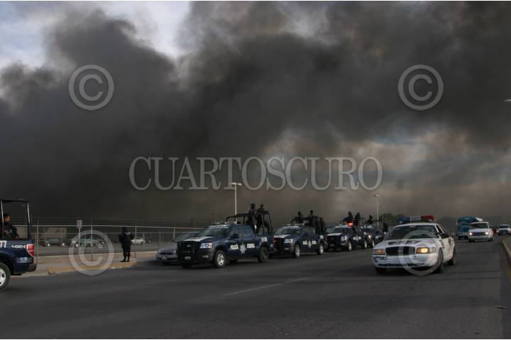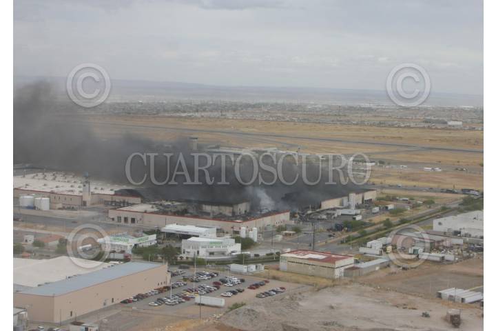 CIUDAD JUAREZ, CHIHUAHUA, 09ABRIL2009.- Un Incendio en una fábrica de portarretratos que duro alrededor de 24 horas, consumió tres maquiladoras y los daños calculados es de varios millones de pesos. Según reportes de los bomberos basados en testigos el incendió fue provocado por una falla eléctrica. El aeropuerto internacional Abraham González cerro durante la tarde y noche de ayer miércoles debido a la acumulación de ceniza en la pista aérea . FOTO: BIENINFORMADO/CUARTOSCURO.COM
