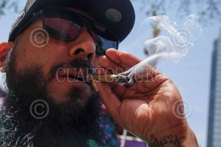 CIUDAD DE MÉXICO, 20ABRILO2025.- Un joven fuma marihuna durante el "Festival 4:20 Nacional 2025", realizado en el marco por el "Día Mundial de la Marihuana" en el Ángel de la Independencia por distintos colectivos, quienes demandan trato digno, posesión y cultivo libre, así colo espacios compartidos en igualdad para consumidores de cannabis. FOTO: MAGDALENA MONTIEL/CUARTOSCURO.COM