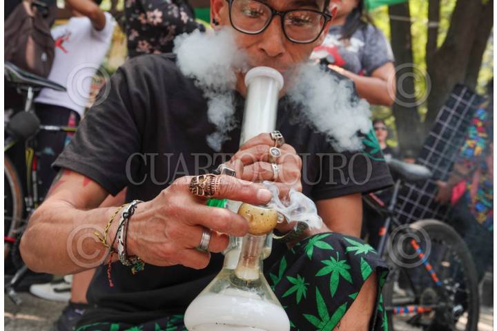 CIUDAD DE MÉXICO, 20ABRILO2025.- En el marco por el "Día Mundial de la Marihuana" distintos colectivos realizaron el "Festival 4:20 Nacional 2025" en el Ángel de la Independencia. En la imagen, una persona fuma cannabis en un bong. Existen diferentes maneras de consumir marihuana, una de ella es mediante un método de vaporización de agua conocido como "bong". FOTO: MAGDALENA MONTIEL/CUARTOSCURO.COM