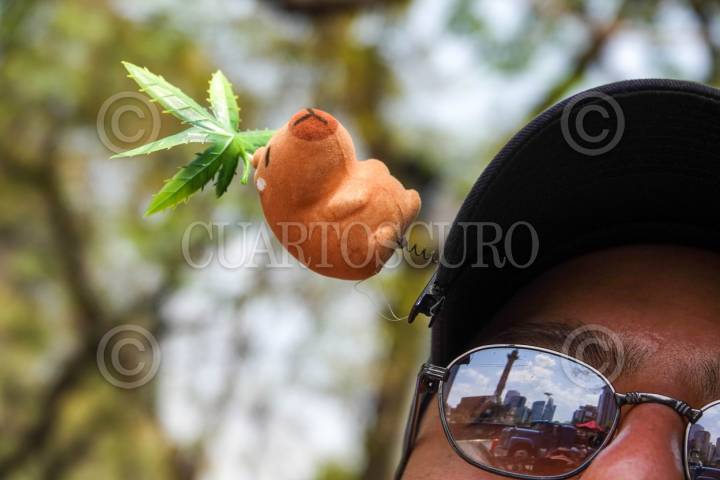 CIUDAD DE MÉXICO, 20ABRILO2025.- Un joven porta en su gorra un Capibara con una hoja de marihuna durante el "Festival 4:20 Nacional 2025", realizado en el marco por el "Día Mundial de la Marihuana" en el Ángel de la Independencia por distintos colectivos, quienes demandan trato digno, posesión y cultivo libre, así colo espacios compartidos en igualdad para consumidores de cannabis. FOTO: MAGDALENA MONTIEL/CUARTOSCURO.COM