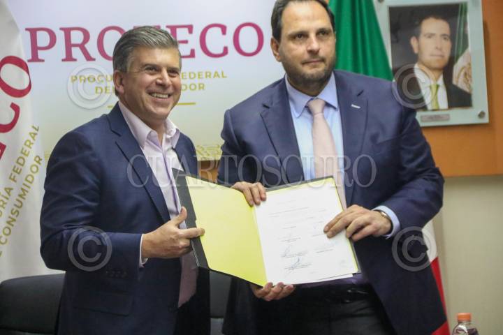 Ricardo Sheffield, de la Profeco durante la firma de convenio entre está dependencia y la Canirac representada por Germán F. González.