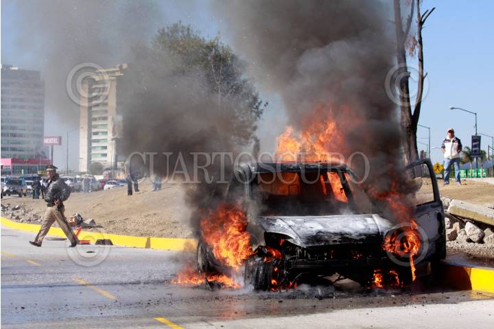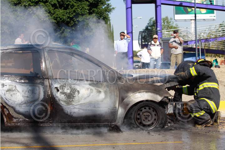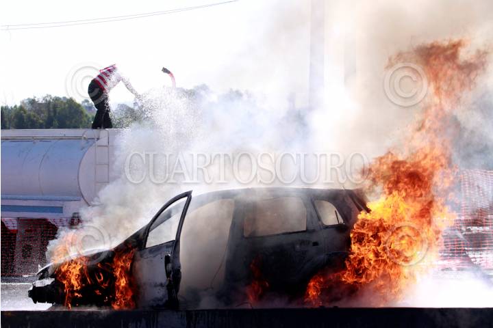 PUEBLA, PUEBLA, 23FEBRERO2009.- Elementos del cuerpo de bomberos apoyados con una pipa de agua sofocaron las llamas que consumieron a un automóvil Ford Fiesta color blanco los dos pasajeros abandonaron el vehículo al percatarse que este comenzaba incendiarse FOTO: JAVIER PALACIOS/CUARTOSCURO.COM
