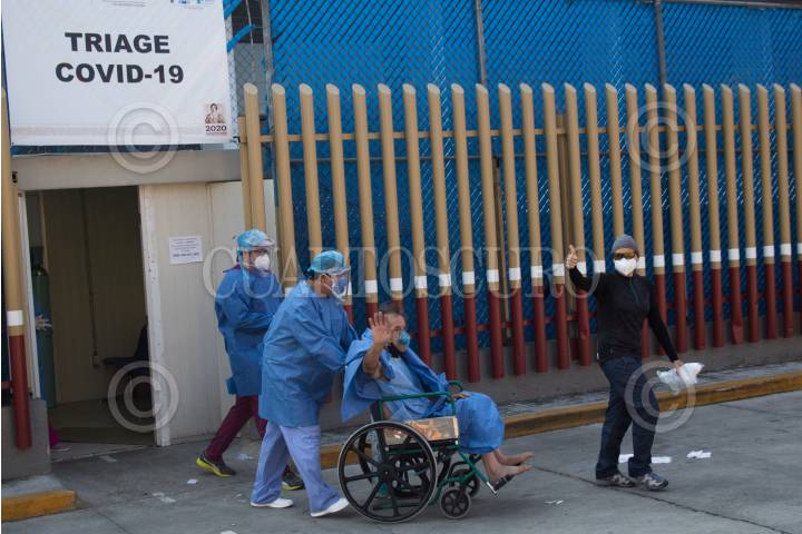 Un pacientes con síntomas de Covid-19 sale del cubículo de Triage y saluda a los reporteros gráficos que hacen guardia en el lugar