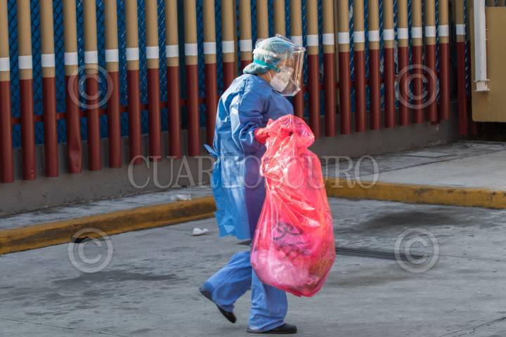Personal médico recoge los desechos del cubículo de Triage Covid-19