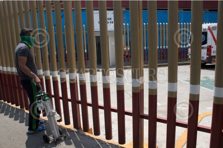 Un hombre espera con un tanque de oxígeno fuera del Hospital General, en el área en donde son recibidos las personas con síntomas de Covid-19