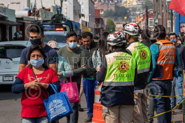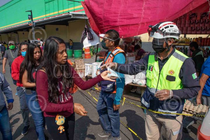 Personal de protección civil de Tlaxcala reparte gel antibacterial y cubrebocas a los asistentes al tianguis de abasto popular.