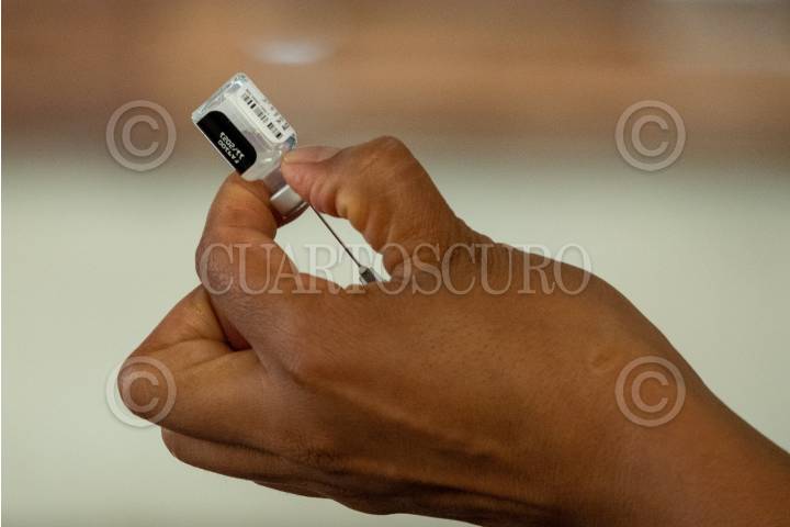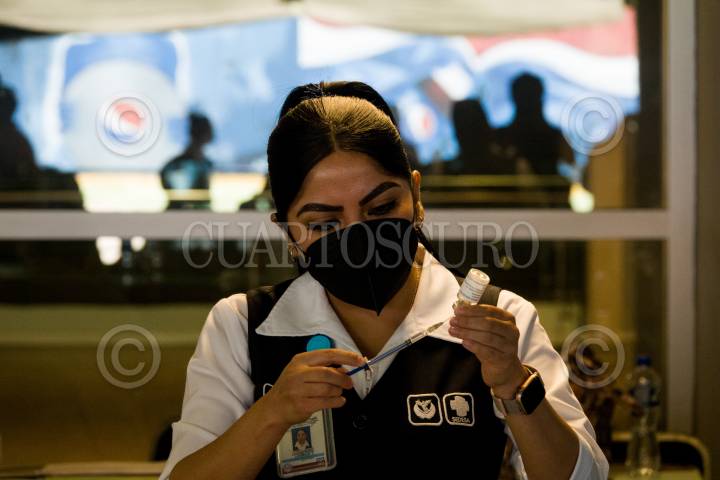 Preparación de una dosis pfizer en el módulo de vacunación contra covid-19 en la Biblioteca Vasconcelos para personas de 40-49 años.