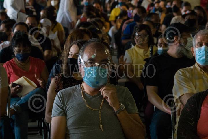 Un hombre con cubrebocas y careta, así como un rosario, permanece en la zona de observación tras ser vacunado con la dosis de AstraZeneca en Azcapotzalco.