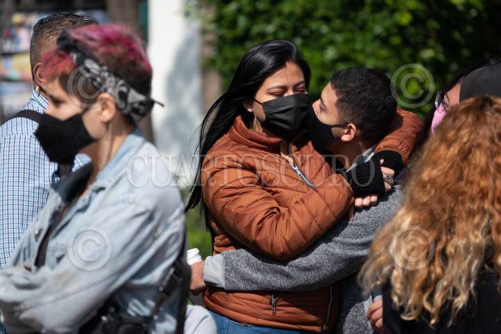 Dos jóvenes expresan su amor durante la fila del kiosco de pruebas rápidas Covid-19 en la alcaldía Cuauhtémoc.