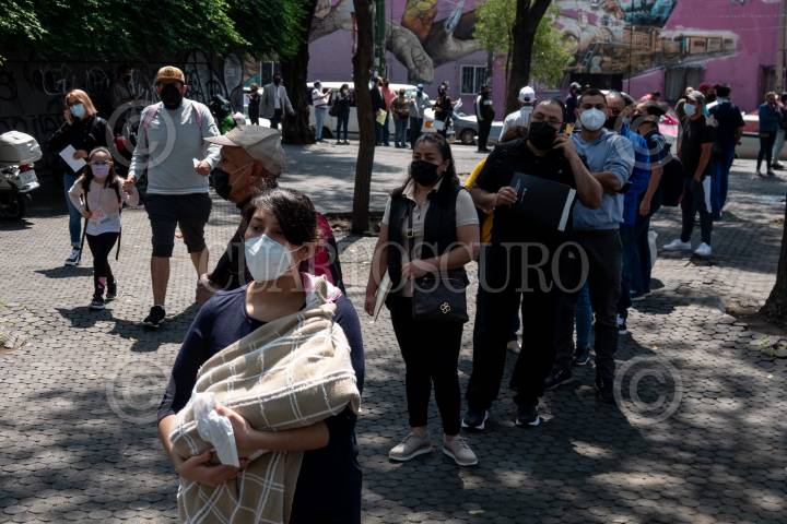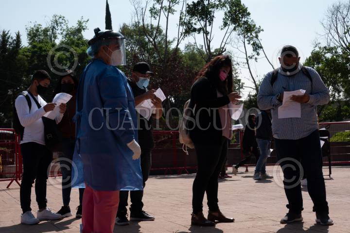 Personas jóvenes esperan su turno kiosco Covid-19 en la alcaldía Cuauhtémoc tras el aumento de contagios en población infanti y de 18 a 39 años.