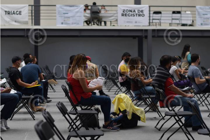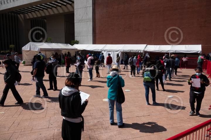 Fila en el módulo de vacunación contra covid-19 en la Biblioteca Vasconcelos para personas de 40-49 años.