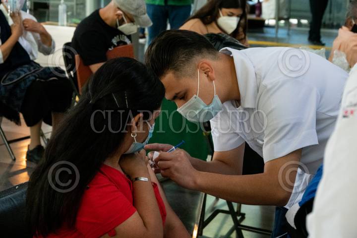 Una mujer es inmunizada en el módulo de vacunación contra covid-19 en la Biblioteca Vasconcelos para personas de 40-49 años.