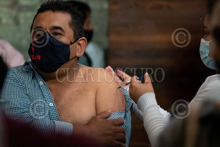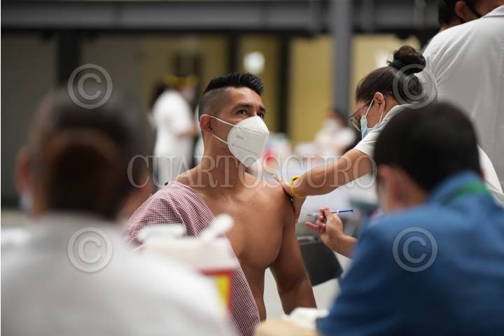 Un hombre es inmunizado en el módulo de vacunación contra covid-19 en la Biblioteca Vasconcelos para personas de 40-49 años.