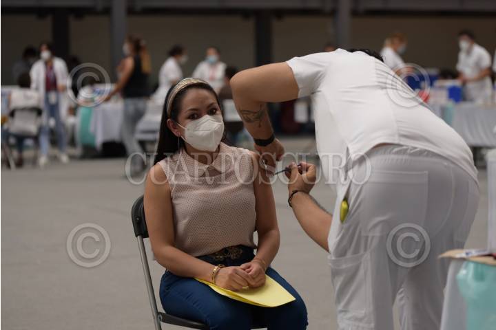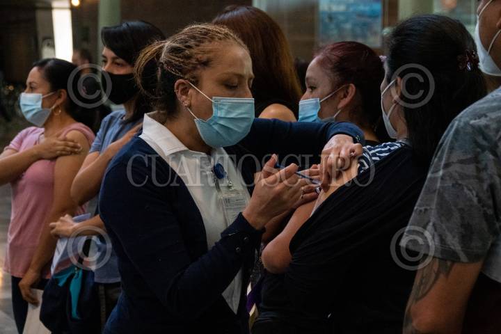 Mujeres son inmunizadas en el módulo de vacunación contra covid-19 en la Biblioteca Vasconcelos para personas de 40-49 años.