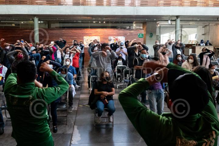 Personas que fueron inmunizadas realizan activación física en el módulo de vacunación contra covid-19 en la Biblioteca Vasconcelos para personas de 40-49 años.