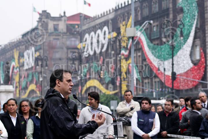 MÉXICO, D.F., 07SEPTIEMBRE2009.- Marcelo Ebrard, jefe de Gobierno del Distrito Federal, rindió un informe de las acciones tomadas por su gobierno para contar con un transporte sustentable, en la Plaza del Empedradillo, en el Centro Histórico. FOTO: ISAAC ESQUIVEL/CUARTOSCURO.COM