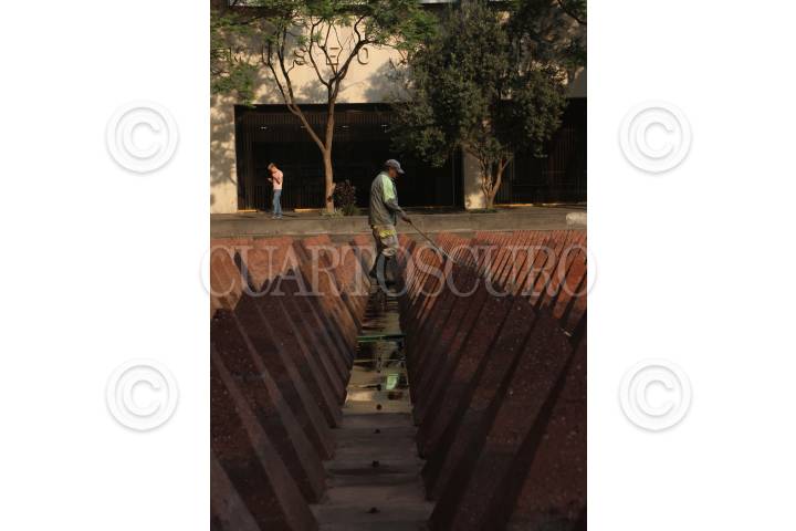 CIUDAD DE MÉXICO, 17MAYO2019.- Trabajadores de la ciudad trabajan las primeras horas del viernes limpiando la fuente de la Secretaría de Relaciones Exteriores, sin ningún tipo de de protección pese a la contingencia extraordinaria que afecta al Valle de México. FOTO: ROGELIO MORALES /CUARTOSCURO.COM