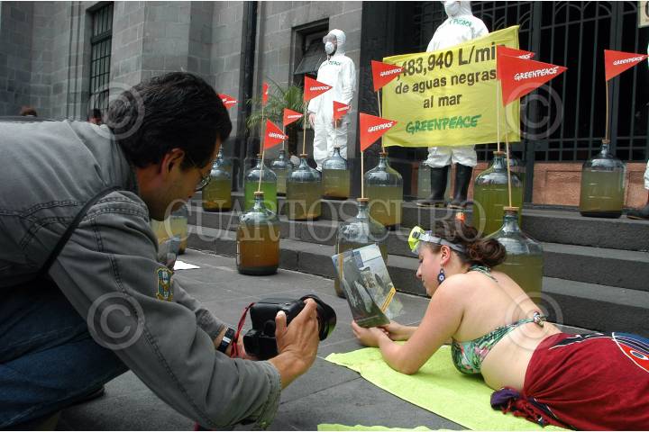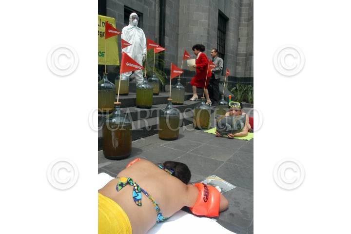 MÉXICO D.F. 28JUNIO2007.- Integrantes de la organización ecologista ¨Greenpeace¨, realizarón una protesta frente a la Secretaría de Salud. Los manifestantes llevaron diversas muestras de agua de mar que tomaron de las playas de Veracruz. Greenpeace denuncia que no existe plantas de tratamiento para las aguas negras en los diversos puntos turísticos. FOTO: GERMÁN ROMERO/CUARTOSCURO.COM