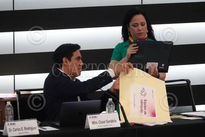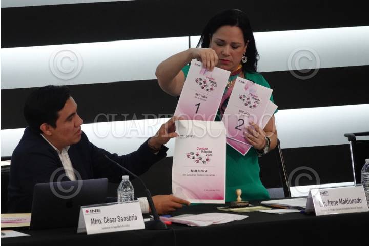 César Sanabria, subdirector de Seguridad Informática, e Irene Maldonado, directora oficial del INE, durante la selección de muestras para los conteos rápidos de los Procesos Electorales Locales 2022-2023 en el Auditorio del Instituto Nacional Electoral