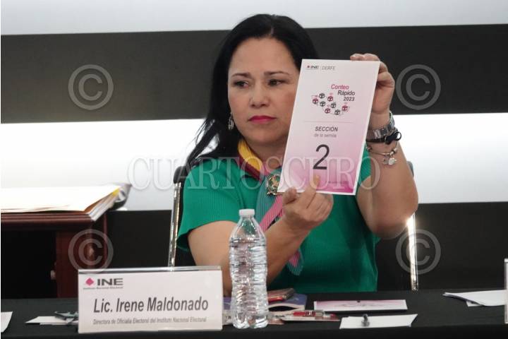 Irene Maldonado, directora oficial del INE, durante la selección de muestras para los conteos rápidos de los Procesos Electorales Locales 2022-2023 en el Auditorio del Instituto Nacional Electoral